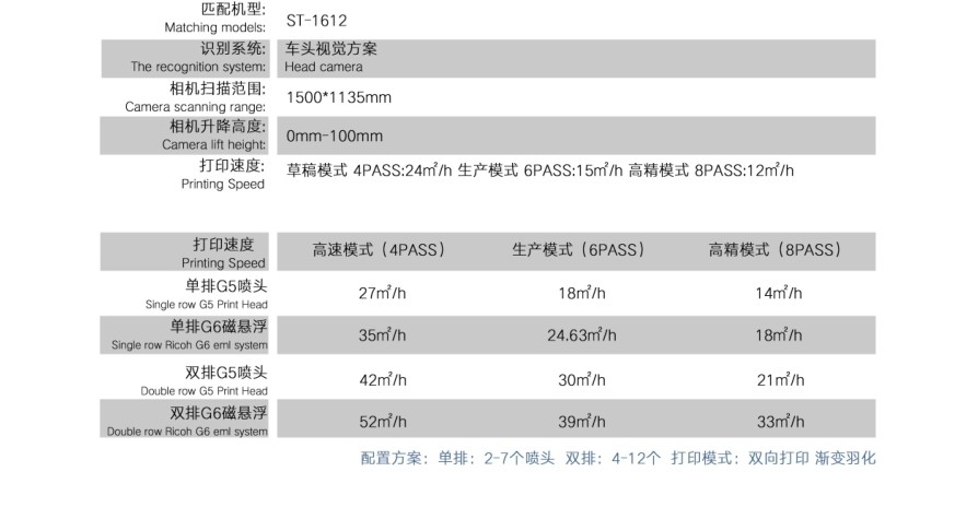 磁懸浮理光G6配置:草稿模式 4PASS:60㎡/h 生產模式6PASS:45㎡/h 高精模式 8PASS:30㎡/h