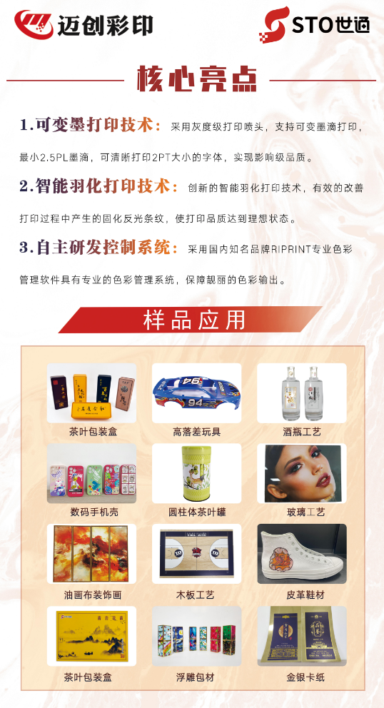 茶葉的包裝,一般可分為軟、半硬、硬包裝3種。世通uv打印機都能兼容打印,具備有圖即打、快速固化、油墨環(huán)保、打印后無毒無味、防水耐候等眾多優(yōu)點,已被全國各個有名的產(chǎn)茶區(qū)如福建、安徽、浙江等地的茶商認可和大范圍應用。